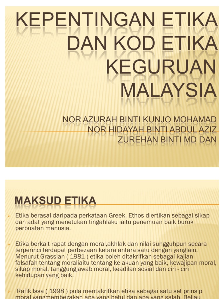 Satu sistem dasar akhlak adat atau tingkah laku atau kesusilaan Dewan Bahasa Pustaka 1995. Kod Etika dalam bentuk dokumen usaha untuk menyemak semula kod ini dapat. Sesuai untuk dirujuk dan diamalkan oleh guru.